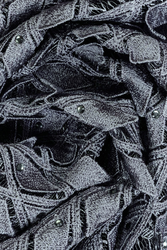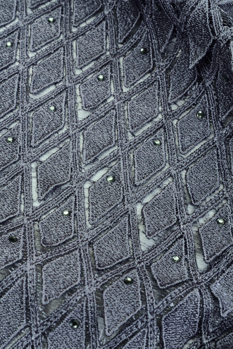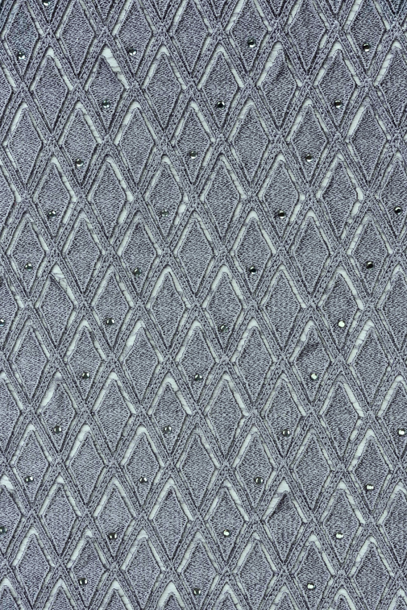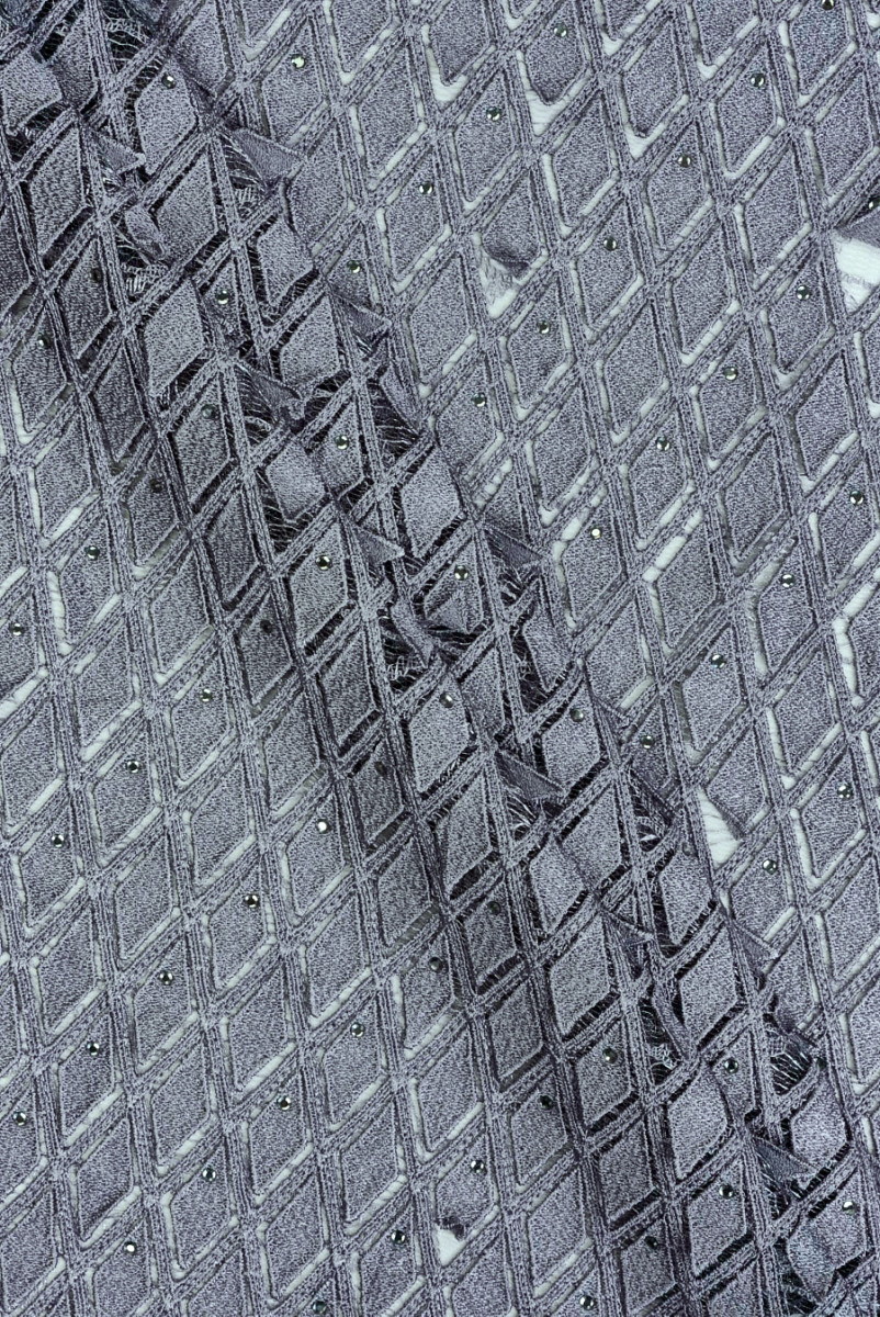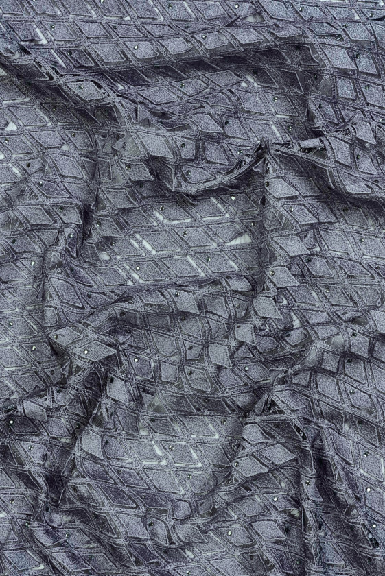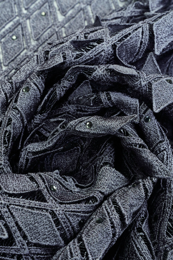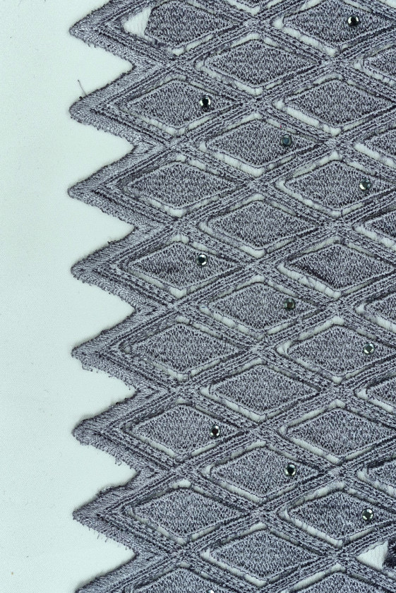 Beautiful guiur in gray in geometric pattern. The guipiura has siymilki glued on it. The diamonds from which it is composed are sewn from two sides, and the two sides remain free, which creates the impression of spatiality of the fabric. Perfect for dresses or blouses.