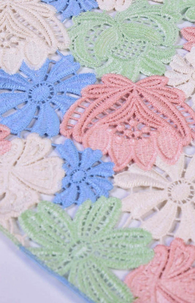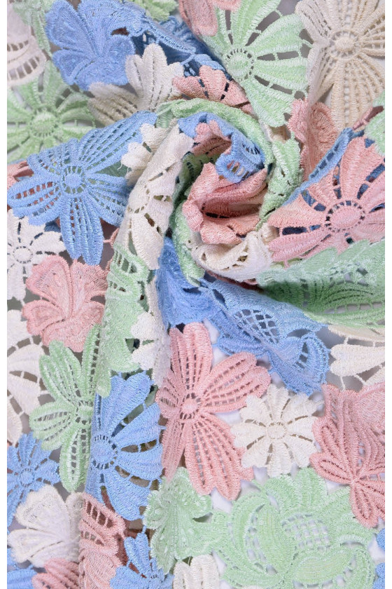 Beautiful floral guipure lace in pastel colors. Heavy, thick fabric. Perfect for skirts, dresses or for cutting out elements. The width of the lace is 45 cm.