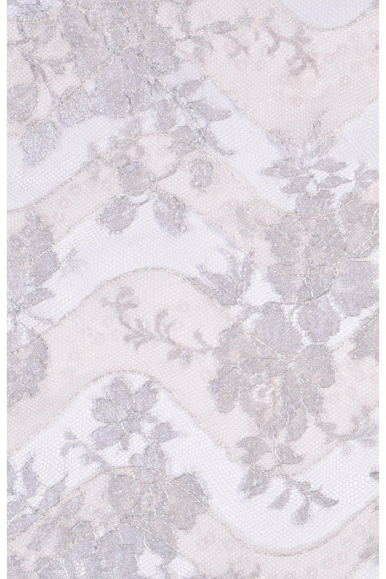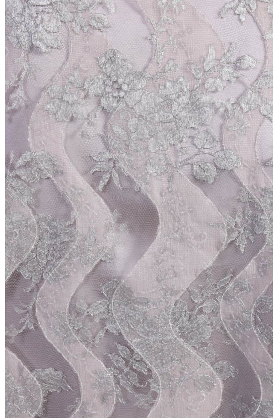 Phenomenal lace in gray-beige with a motif of waves and flowers made of shiny thread. Every second wave is lined with silk chiffon and decorated with transparent sequins. The width of the lace is 80 cm. It is transparent, lightweight, inelastic and shines beautifully. Perfect for dresses or blouses.