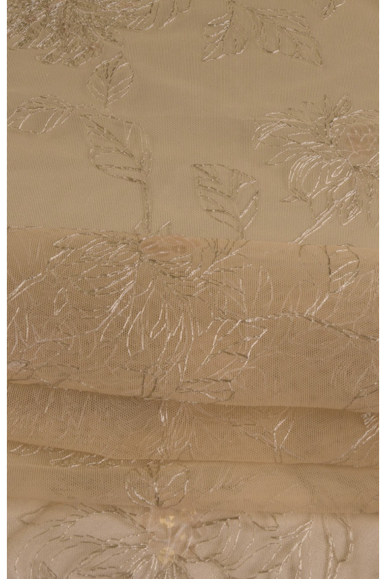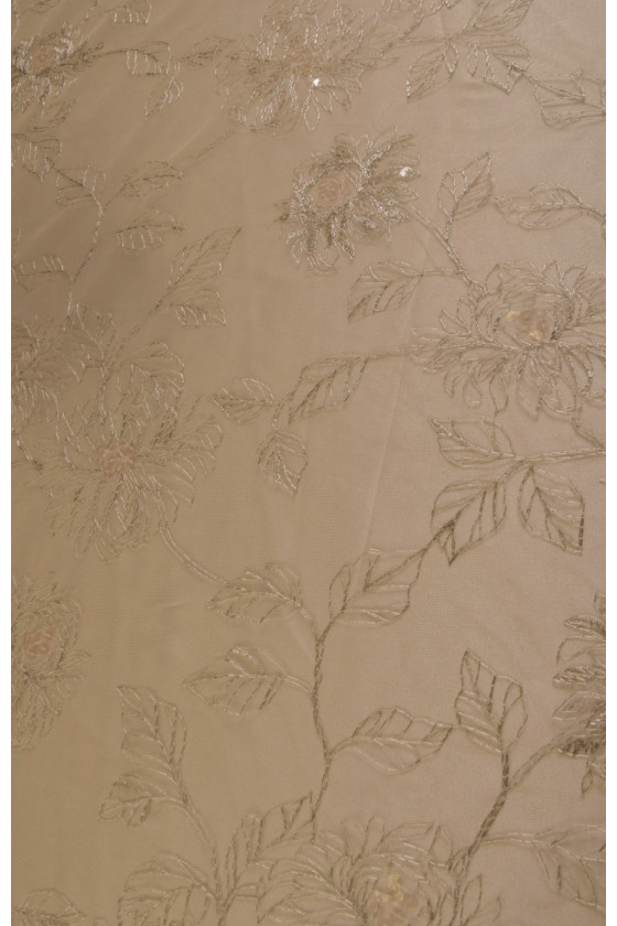 Beige lace embroidered in a delicate pattern of large flowers, to which transparent sequins are sewn, thanks to which the fabric shimmers discreetly. The structure is moderately rigid. We recommend choosing satin as a lining.