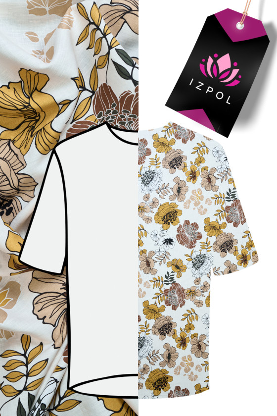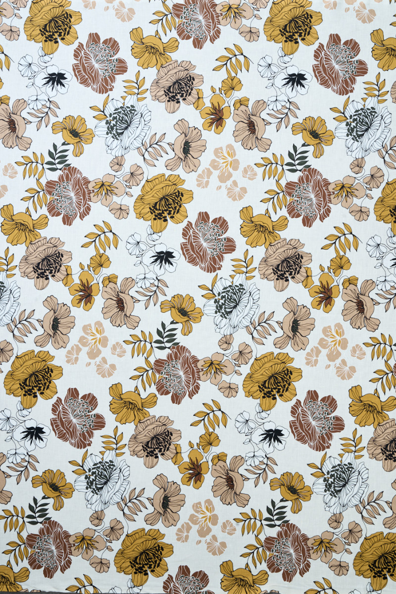Italian linen fabric with an admixture of ecru cotton with large flowers in beige, brown, white and yellow. The flowers are of different sizes, with a large predominance of larger flowers. The fabric is thin but opaque, soft, intended for summer dresses, skirts and shirts.