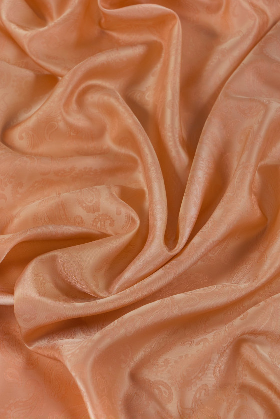 Italian jacquard lining with an oriental motif - beige-apricot bitone. Fabric inflexible, slightly shiny. Perfect for lining coats, jackets, vests, jackets. Composition: 100% acetate Acetate, like viscose, is made from cellulose. It differs from viscose in the way yarn is made. Acetate yarn can also be made from processed cellulose, e.g. paper. In addition, acetate is finished acidic, i.e. in acidic brine, thanks to which it obtains increased resistance to discoloration. Acetate lining perfectly absorbs moisture and is breathable.