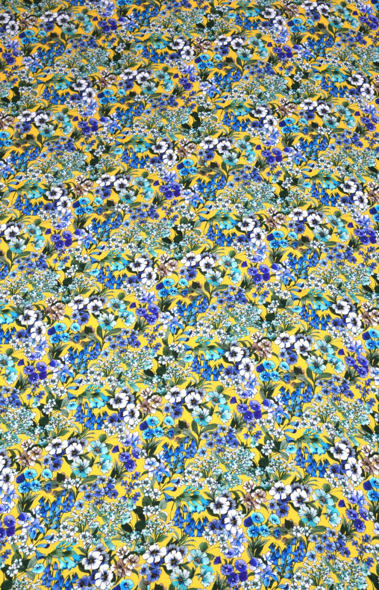 Dress viscose with a colorful meadow, soft and well-fitting, medium thickness. We recommend sewing summer dresses, blouses and skirts from it. It is not see-through, you can sew it without lining. Very good quality fabric. The grammage is also suitable for sewing women's shirts. We recommend steaming before sewing, as viscose fabrics can have a tendency to shrink. Colors: white, purple, blue flowers on a yellow background.