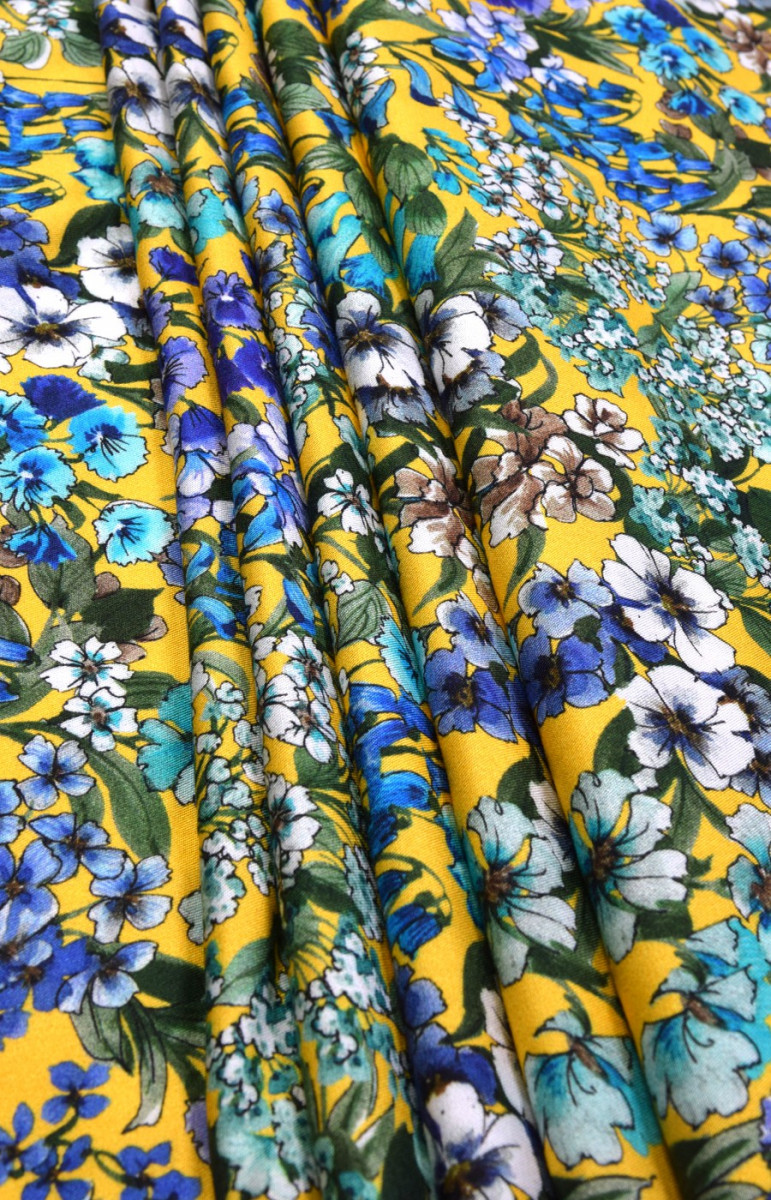Dress design with colorful link, soft and well-arranged, medium thickness. We recommend to sew from it summer dresses, blouses, skirts. It is not translucent, you can sew it without lining. Fabric of very good quality. The weight is also suitable for sewing women's shirts. We recommend to perform a decatization before sewing, because viscose fabrics may show a tendency to shrink. Colors: on a yellow background- white, purple, blue flowers.