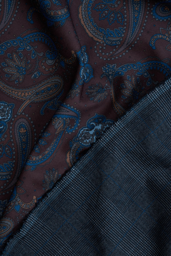 Original, elastic double-sided knitted fabric - on one side pasley pattern in brown and navy blue colors, on the other - navy blue and gray check.
