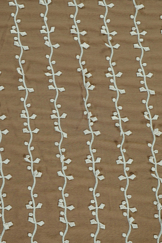 Italian evening fabric - dark olive chiffon (two-tone black/olive) with beautiful guipure embroidery in ecru color. An interesting motif of twigs arranged in vertical stripes every 5 cm. The fabric is finished on both sides with a decorative tooth. Thin, transparent fabric (requires lining), light - perfect for sewing a dress, blouse, skirt.