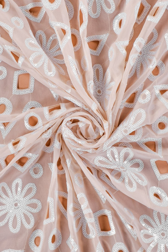 Italian polyester chiffon in light beige. Fabric with a motif of laser-cut, geometric patterns and a floral motif, beautifully trimmed with pearl-colored sequins. Light, airy, transparent fabric - perfect for sewing a dress, skirt, blouse.