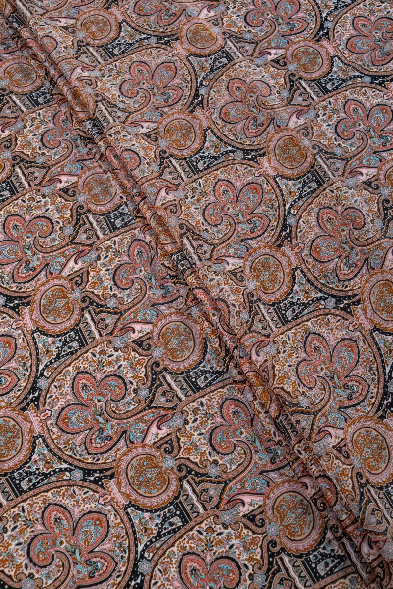 Italian polyester chiffon with an oriental motif in black and beige colors with elements of turquoise and light pink. Chiffon is a very delicate, airy, transparent fabric with a delicate, crescent texture.