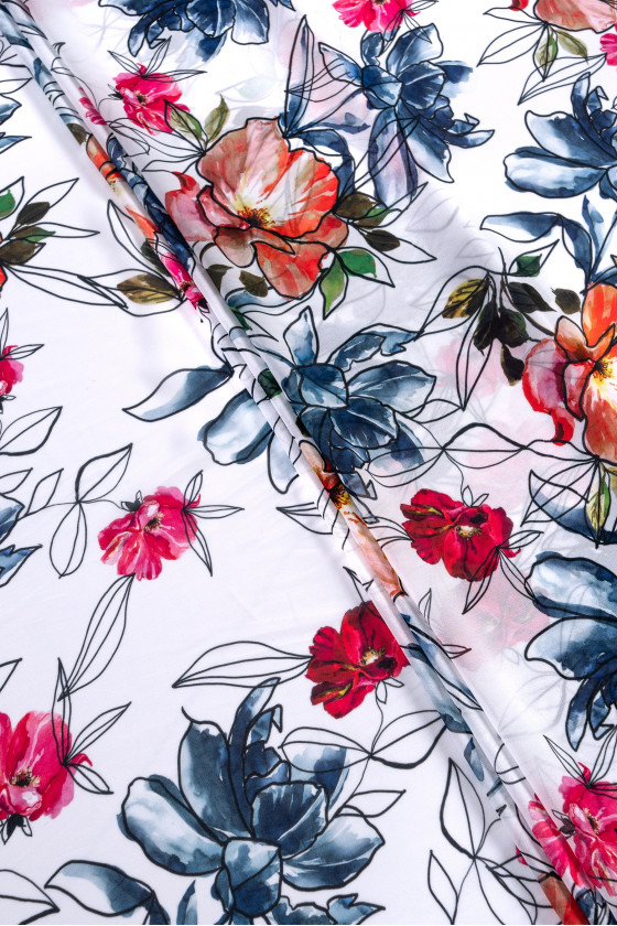 Italian polyester żorżetka in cream color with a motif of colorful flowers. Żorżeta is a fabric with a loose canvas weave of twisted threads, which provides its characteristic, granular surface. It is an airy and delicate, transparent material, it is arranged in a beautiful, flowing way.