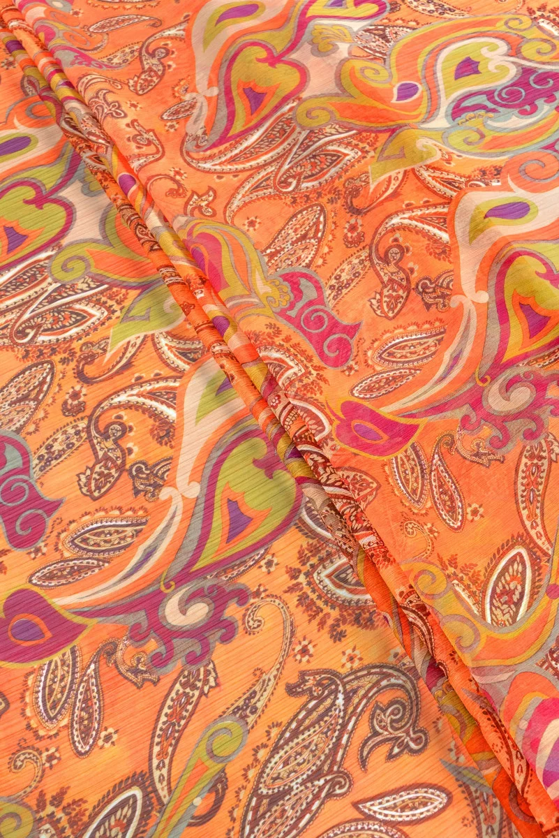Italian polyester chiffon (kresed) with an oriental motif in the colors of redness and orange. Chiffon is lined with a very delicate, airy, transparent fabric with a slightly "crushed" structure.