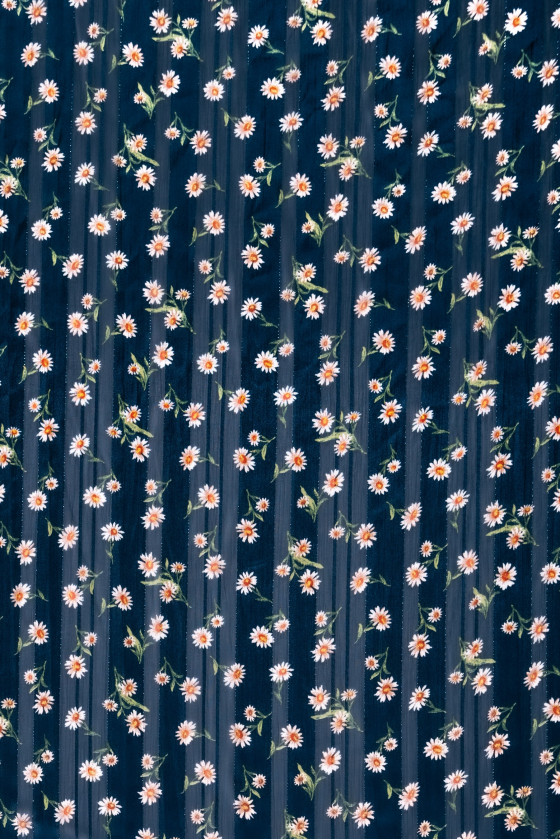 Italian polyester chiffon of the devore species in navy blue with a motif of small flowers (meadow). The devore fabric is a combination of chiffon with additional, satin straps. The fabric is thin, transparent, inflexible, very delicate. Perfect for sewing an airy blouse, skirt, dress or scarf.