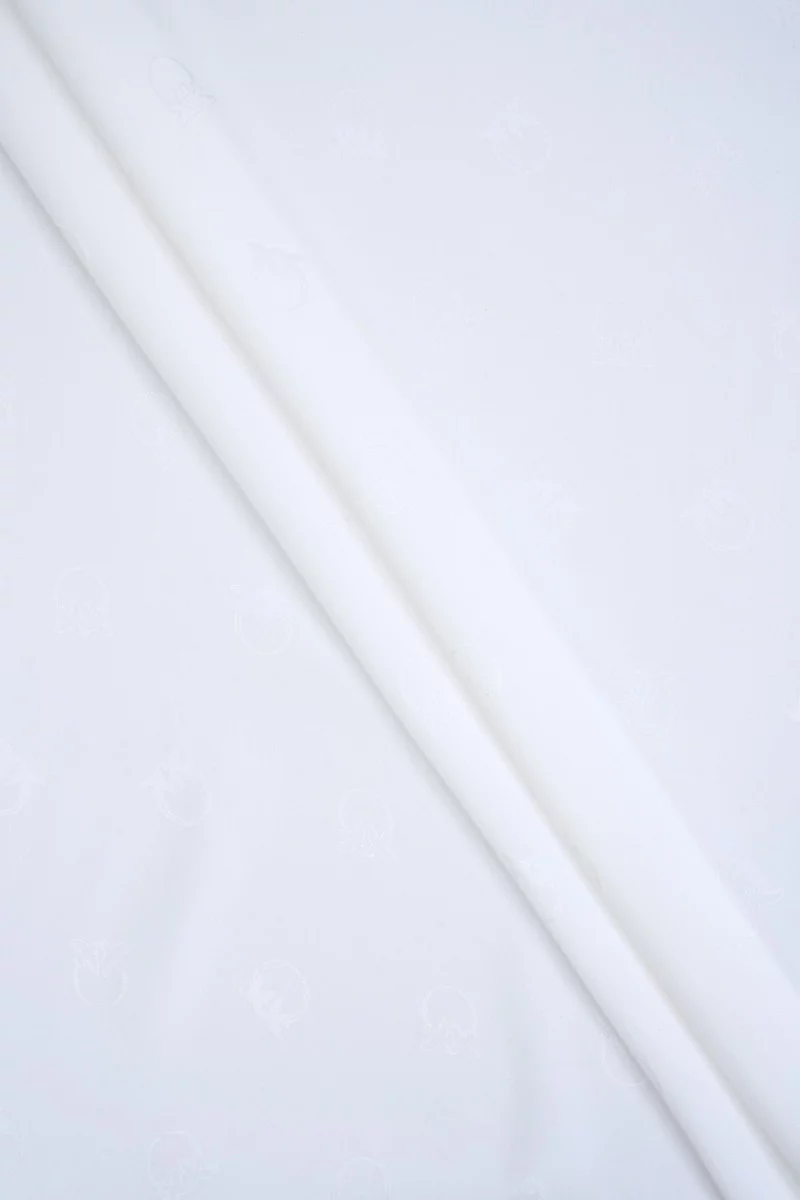 Italian polyester satin in cream color with jacquard patterns, touching birds in the same color. The motif is about 2 cm in diameter and is densely distributed on the fabric, it is the logo of a well-known Fashion House. The fabric is inelastic, thin but opaque with a satin sheen, it drapes softly. A perfect proposition for people who like branded patterns in classic colors.
