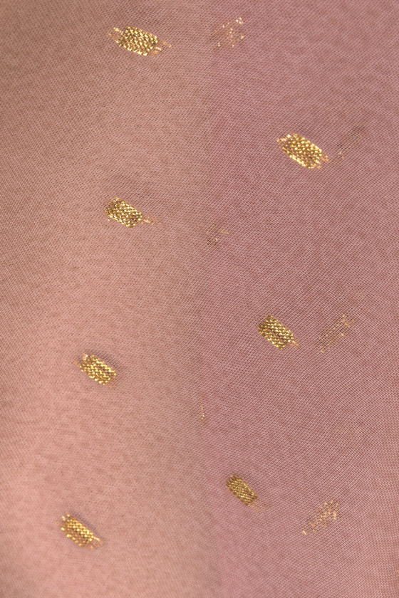 Italian polyester chiffon in dirty pink with a motif of small, geometric patterns made of golden lurex thread. The fabric is thin and flowing, so it is perfect for sewing an airy dress, blouse or scarf. A fantastic proposition for fans of muted, slightly shiny fabrics.