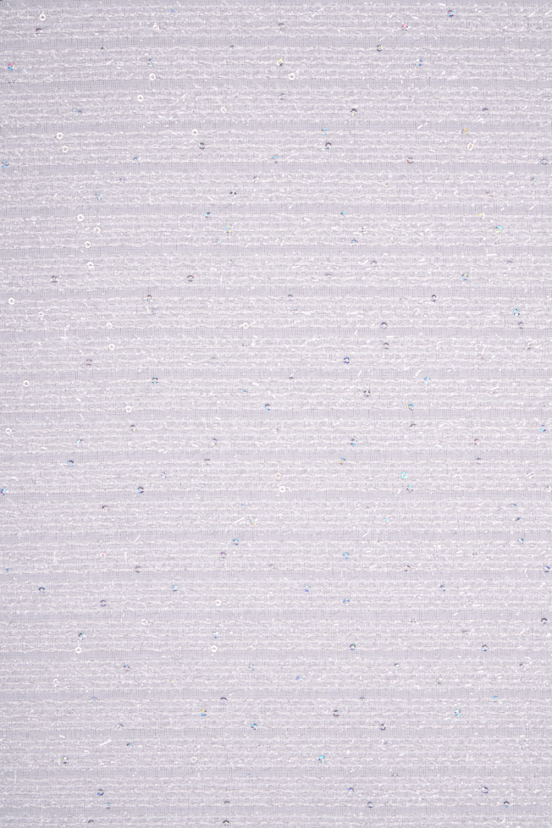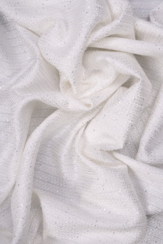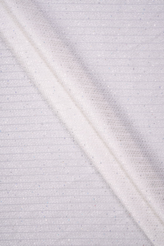 Italian chanel costume fabric in cream color. Smooth fabric with 1 cm wide horizontal stitching, decorated with small sequins. Medium thickness fabric, non-elastic, soft. Perfect for sewing a dress, skirt or for decorative purposes.