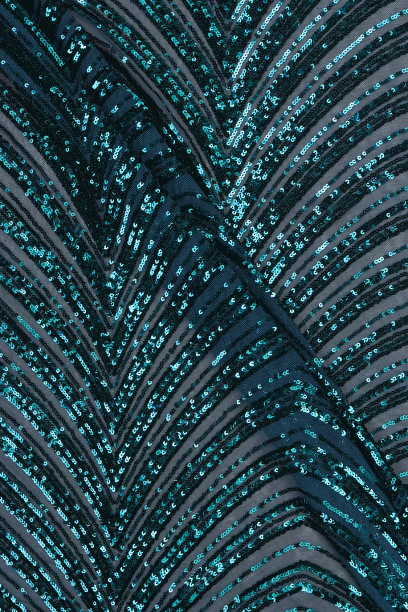Italian evening fabric in a very elegant dark green color. The fabric is made of soft mesh, elastic in both directions, on which shiny sequins are sewn, which create a wave or herringbone pattern - we sew it circumferentially. The fabric is soft, transparent, highly elastic - a beautiful proposition for people who like original patterns but in a classic color. Dark green is a timeless color, always fashionable, it adds chic and elegance to any cut.