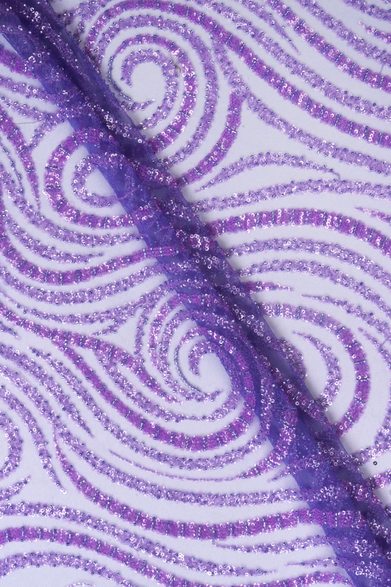 Italian evening fabric in purple color. Stiff tulle in the same color is richly decorated with beads and sequins in two shades of purple, which are arranged in the form of waves. They thicken towards one edge of the fabric - we sew it circumferentially. A fantastic proposition for sewing an evening dress in the most fashionable color. A fabric for people who follow the latest fashion trends.