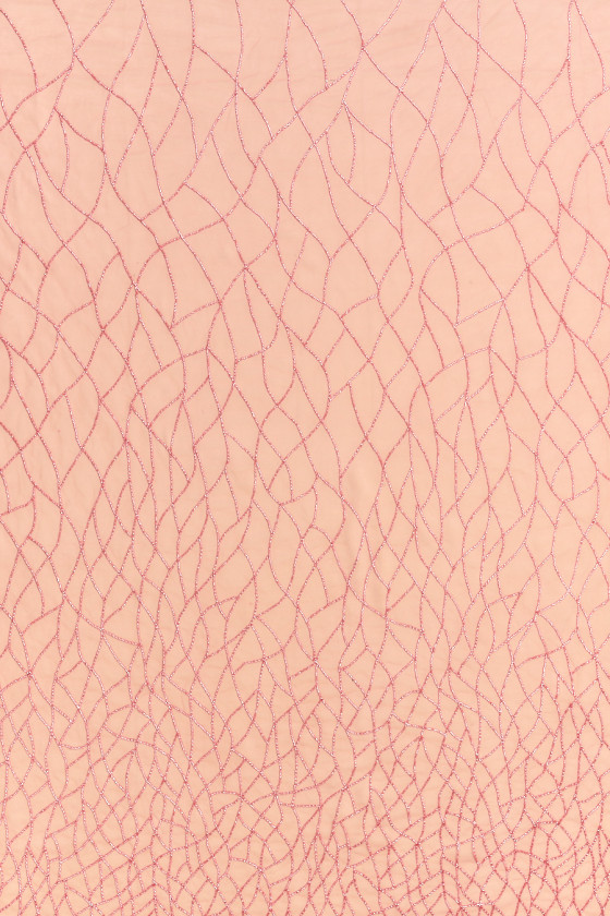 Italian stiff tulle with classic coral-colored eyes. It is subtly decorated with cylindrical beads of the same color. They form a diamond-like geometric pattern that thickens towards one edge of the fabric (there is no decorative finish). The fabric is very impressive, transparent (requires lining), heavy, slightly elastic - we sew it circumferentially. A fantastic proposition to sew an evening dress, skirt or blouse in a very interesting edition.