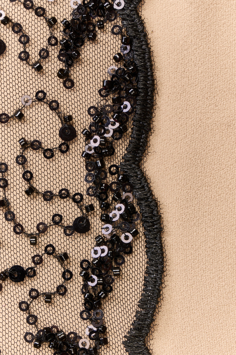 Italian, exclusive tulle with classic black eyelets richly decorated with black beads and sequins. The pattern is arranged in vertical stripes 1.5 cm wide, which diverge into semicircles and thicken towards one edge - the fabric is sewn circumferentially. The edges of the fabric finished with black thread create a delicate wave. It is perfect for sewing an evening dress, blouse or skirt.