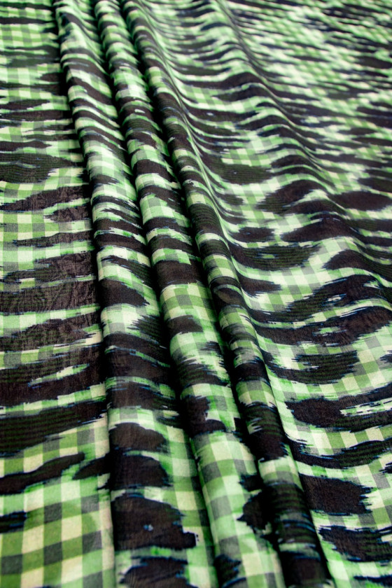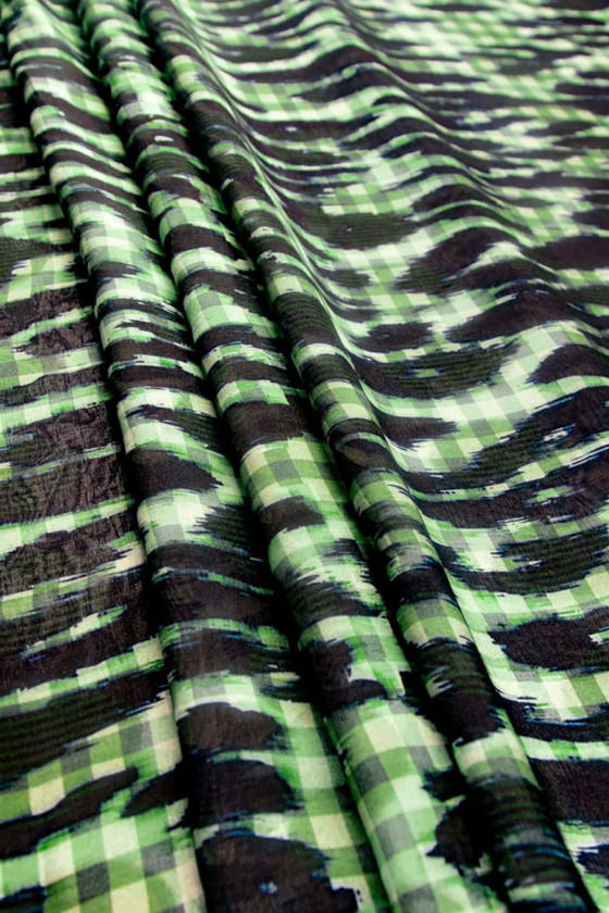 Silk muslin in a fine black-green mint checkered with a pattern of black panther. Muslin is semi-transparent, very delicate in the grip, beautifully laid out,