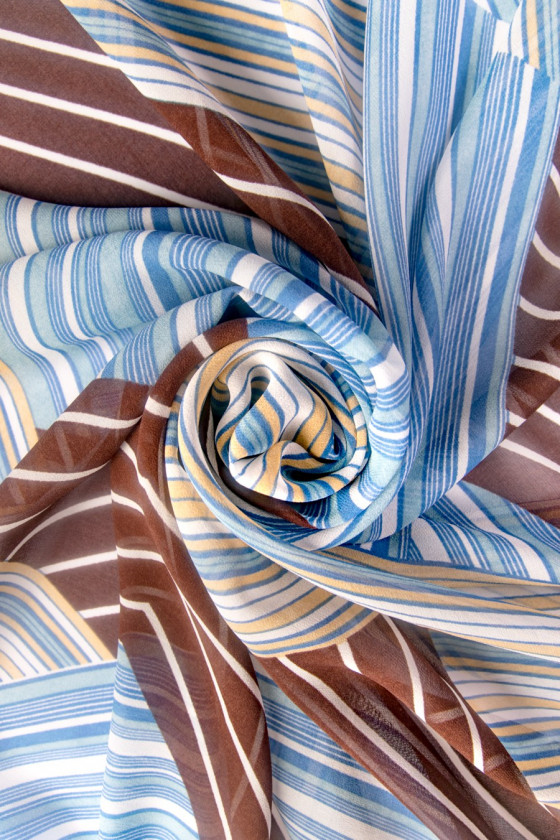 Silk zorżeta in irregular modules with colored stripes (blue-brown-yellow) It is a fabric slightly elastic, matte, very delicate, semi-transparent (requires lining). Perfect for airy dresses and blouses. Proposal for summer heat, fabric 100% natural, very airy.