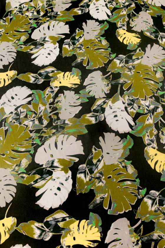 Beautiful Italian silk chiffon in the pattern of large leaves of muted colors- olive,dark green, mustard. Fabric 100% natural, matte, semi-transparent, delicate in the grip, softly laid out. We recommend to sew airy blouses, dresses, tunic, skirts or scarves.