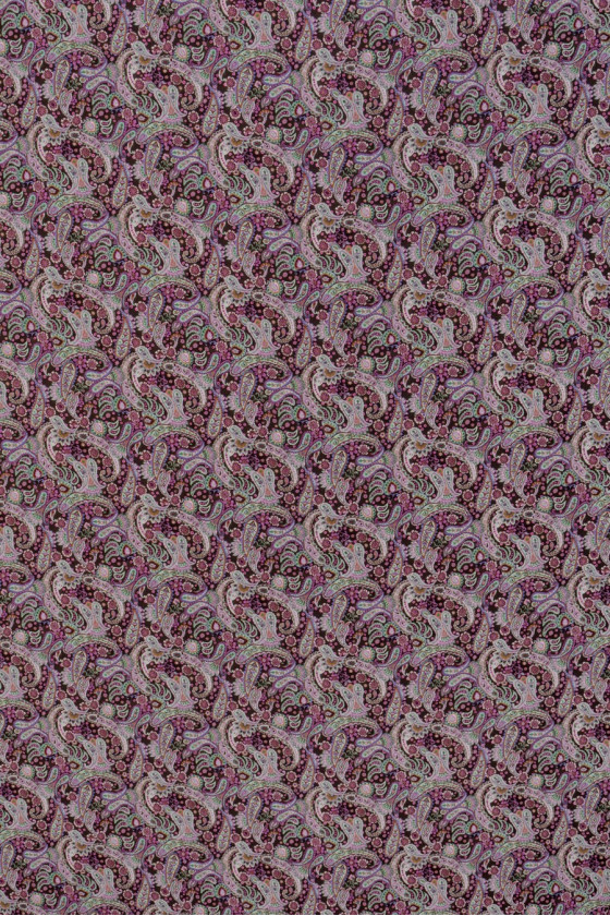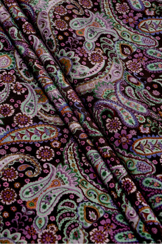 Silk crepe elastic (composed of 96% silk, 4%elastane) in the paisley pattern, that is, so-called colored "beans" also called turkish pattern. On a black background of beans in shades of purple and green
