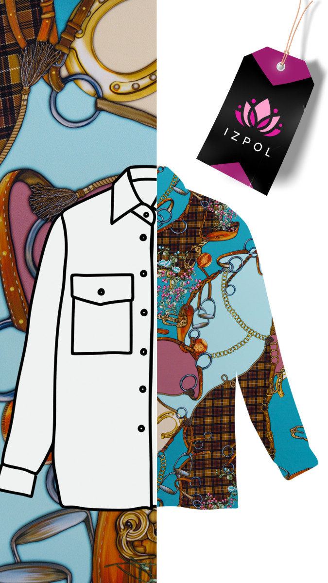 Italian crepe 100% silk in interesting motifs of horse saddles and stirrups - characteristic of the well-known Fashion House. Colors: blue, blue, brown, beige, dirty pink.