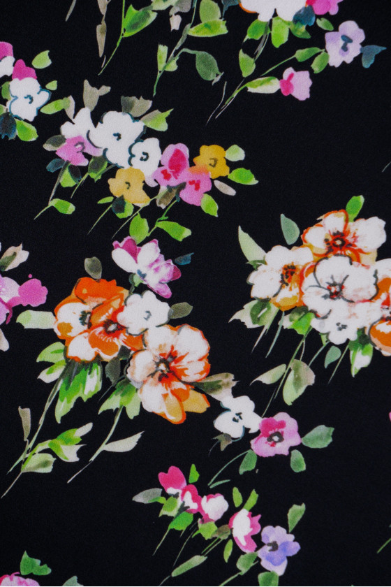 Italian 100% silk crepe in black with a motif of colorful flowers. Silk crepe is a delicate, thin, semi-matte fabric. It can be used to conjure up airy dresses, delicate blouses, scarves and scarves.