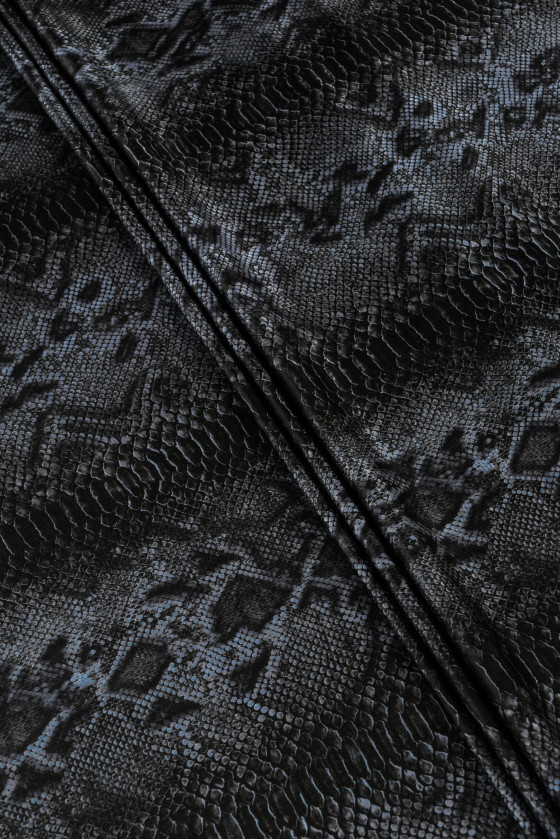 Italian satin 100% silk with snake skin motif in gray-black color. Silk satin is a delicate fabric, velvety to the touch, with a slight shine. You can conjure up airy dresses, delicate blouses, scarves, scarves. Composition: 100% natural silk