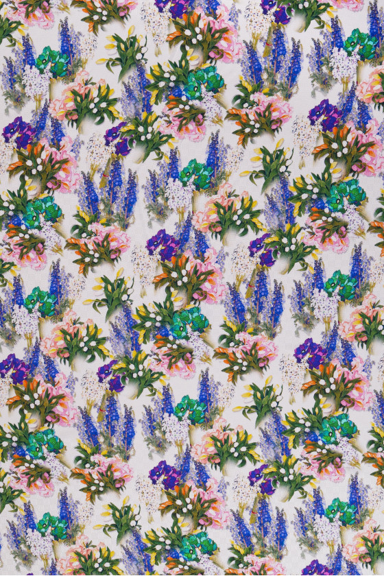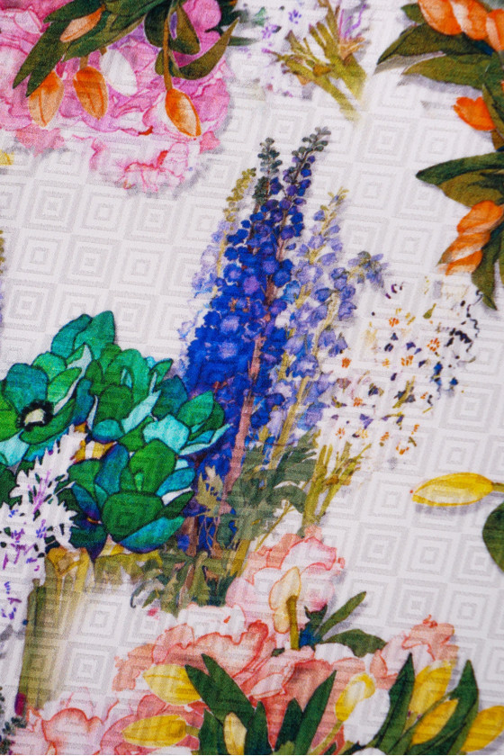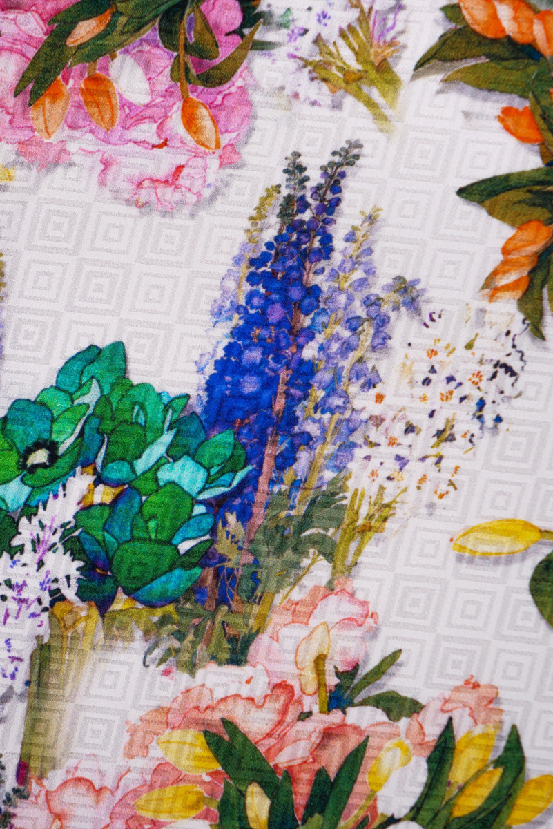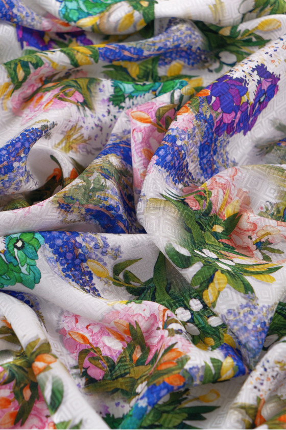 Beautiful Italian fabric 100% silk in cream color with the motif of colorful bouquets of flowers. Fabric with a very original jacquard weave in the form of a matte-glossy cube.