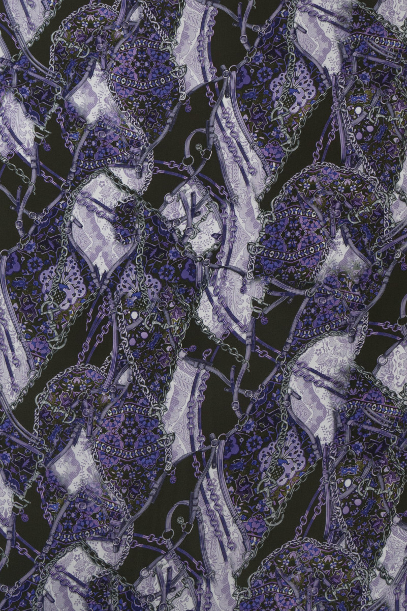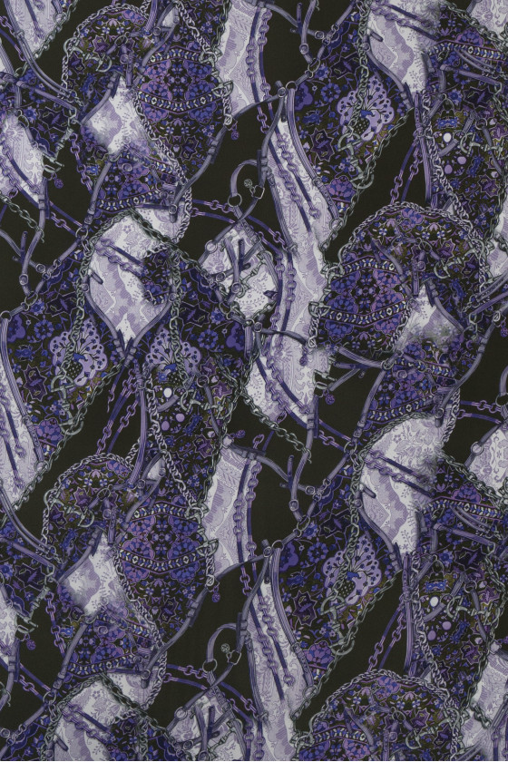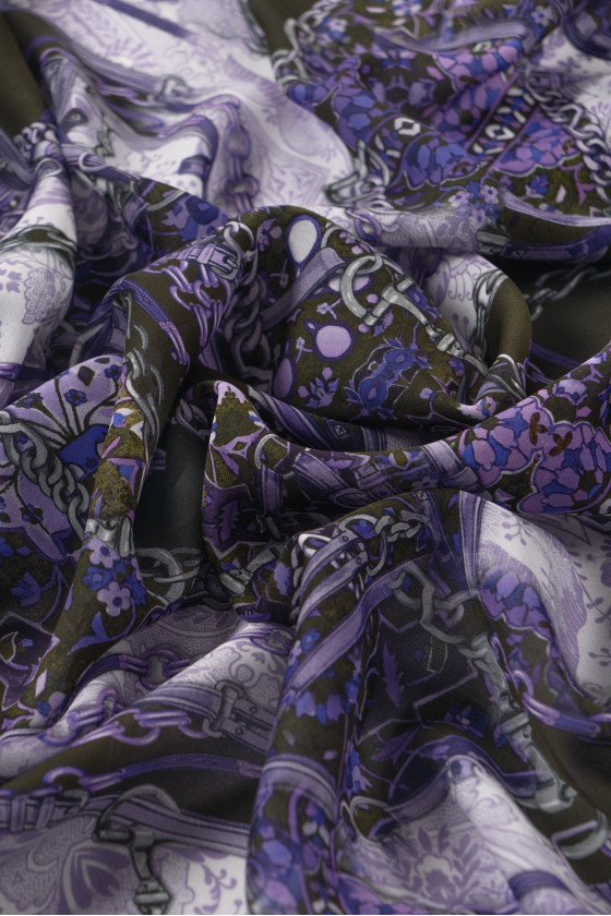 Italian, thicker chiffon 100% silk with a motif of gray-purple chains on a background in the color of very dark green. Chiffon made of natural silk is a very delicate, airy, slightly transparent fabric.