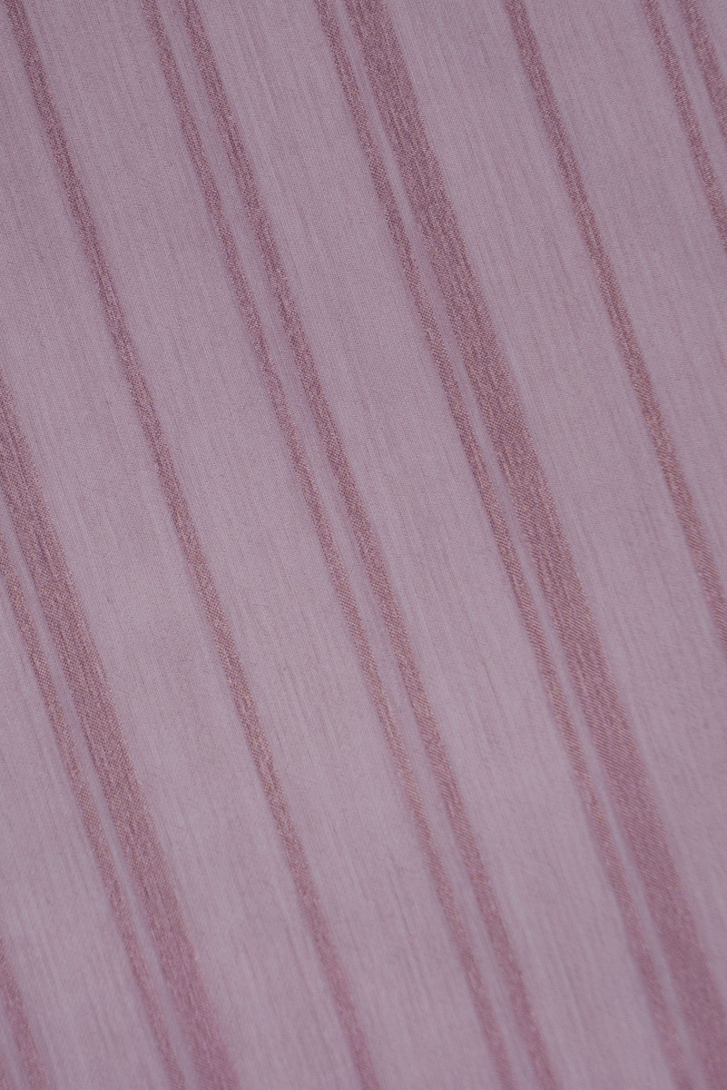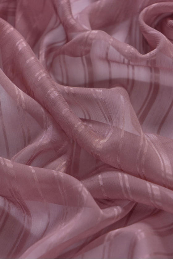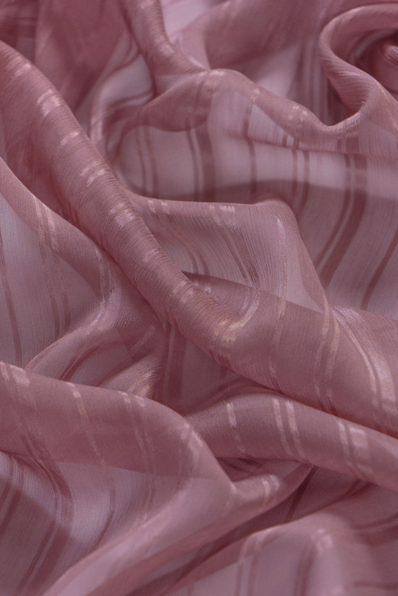 Italian chiffon creased 100% silk in dark, dirty pink. Devore fabric with a motif of stripes with widths of 0.8 cm, 0.5 cm and 0.2 cm. The devore fabric is a combination of creased chiffon with additional, satin stripes. The fabric is thin, transparent, inflexible, very delicate. Perfect for sewing an airy blouse, skirt, dress or scarf.