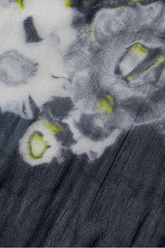 Italian 100% silk organza fabric in a coupon with dimensions of 135 cm* 140 cm. Beautiful two large floral motifs on a gray, slightly creased background.