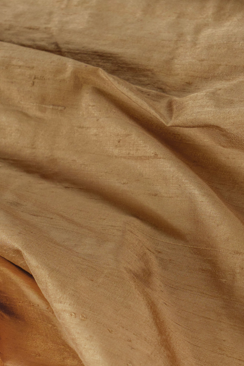Italian fabric 100% silk shantung type in golden beige color. Shandong is a type of soft silk fabric made of raw yarn, with characteristic irregularly distributed, lumpy beads (decoratively threaded yarn) in the weft. It has a slightly rigid, plastic structure.