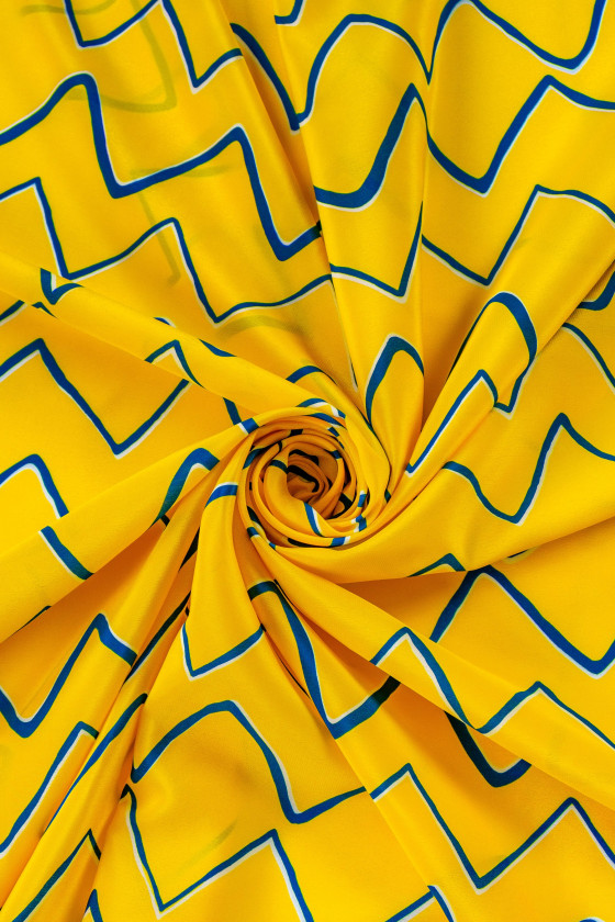 Italian crepe 100% silk in yellow with a motif of blue zigzags, arranged vertically (along the length of the fabric). Silk crepe is a delicate, thin, semi-matt fabric. It is soft to the touch and fits very well.