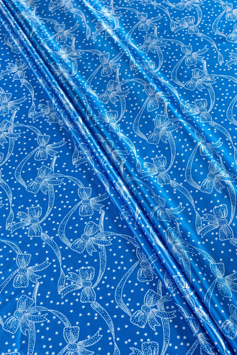 Italian satin 100% silk in blue with a motif of gray and white bows and small stars. Silk satin is a dense and light fabric with a flat surface, made in satin weave.