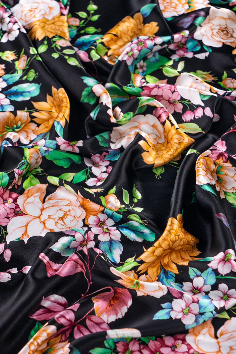 Italian satin 100% silk in black with a medium-sized floral motif. Silk satin is a dense and light fabric with a flat surface, made in a satin weave. An additional advantage is its smoothness and durability, as well as the fact that it drapes very well, does not show through and is pleasant to the touch. On the one hand, it is matte, and on the other, it is nobly glossy. It can be used to conjure up airy dresses, delicate blouses, skirts, scarves, scarves.