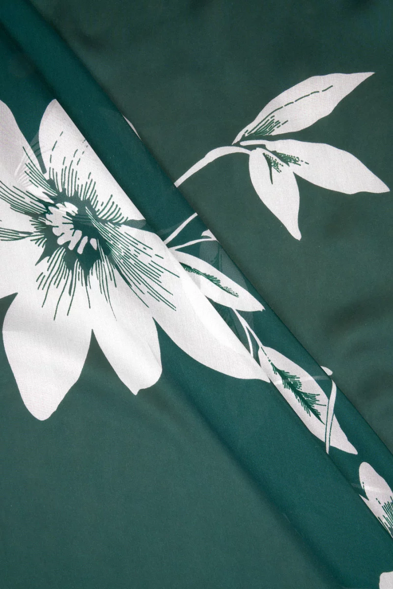 Italian 100% silk muslin in bottle green color with a motif of cream flowers. Natural silk muslin is a very delicate, airy, transparent fabric with a delicate sheen characteristic of silk fabrics. Perfect for airy dresses, skirts and blouses. Non-elastic fabric.