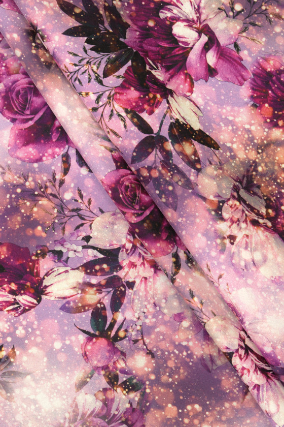 Italian silk satin with the addition of elastane with a print made on a matte side. A beautiful, dense rose flower motif in purple with black and cream accents. The whole thing is made on a shaded, purple and cream background with tiny dots that resemble snow. A fantastic proposition for people who like floral motifs in calm colors. This fabric is perfect for sewing a dress, skirt or beautiful shirt.