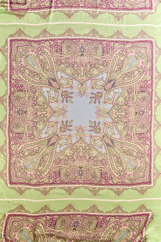 Italian 100% silk muslin with a motif of oriental patterns in green, blue, fuchsia. The fabric comes in coupons with dimensions of 140cm*140cm. Natural silk muslin is a very delicate, airy, transparent fabric with a delicate sheen characteristic of silk fabrics. Perfect for light dresses, blouses or skirts.