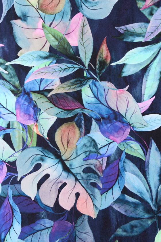 Italian silk satin with elastane with a motif of colorful leaves on a shaded black and navy blue background. The pattern is made in sea green colors beautifully enriched with neon accents in purple, pink and green. The fabric is soft, elastic, and drapes beautifully. Printed on a matte side. It is perfect for sewing an original shirt, dress or skirt.