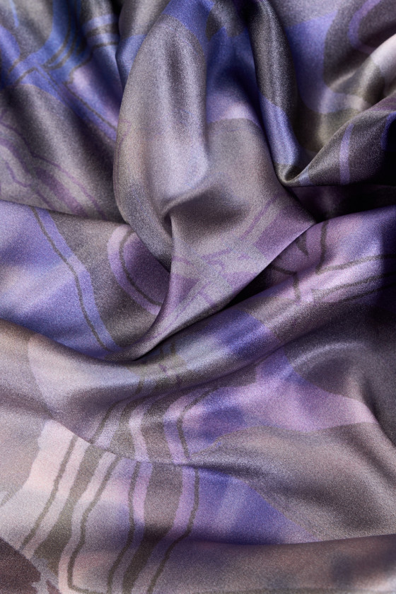 Italian silk satin with elastane on a shaded purple-blue background is placed with fuzzy gray leaves that sharpen along one edge. The pattern is additionally enriched with accents in a very light purple color, which delicately illuminate the entire material. The fabric is soft, elastic and drapes beautifully. A perfect proposition in subdued colors for people who like elegant and timeless color combinations.