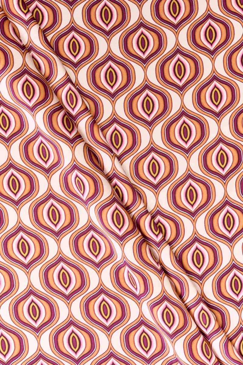 Italian silk satin with elastane with a regular peacock eye pattern on a beige background. Densely arranged motifs with a size of 5cm*5cm in red, burgundy and pink colors. Silk satin is a dense and light fabric with a flat surface, the addition of elastane makes it more comfortable to wear and creases less. It is perfect for sewing a beautiful shirt, skirt and looser trousers.