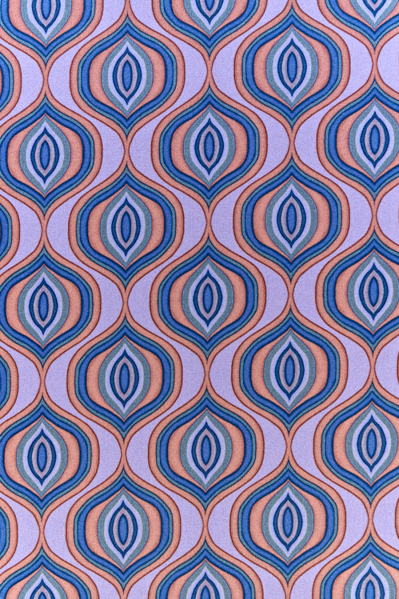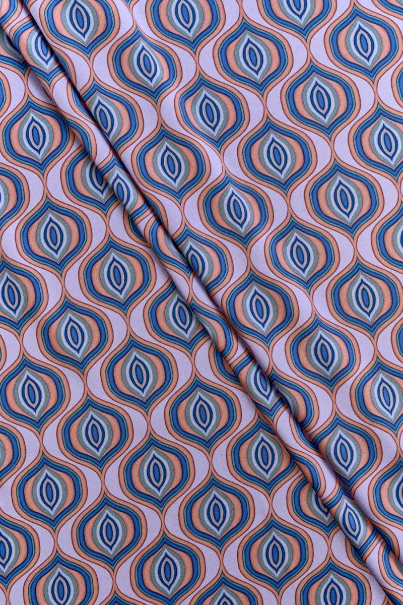 Italian silk satin with elastane with a regular peacock eye pattern on a violet background. Densely stacked motifs with a size of 5cm*5cm in light brown, blue and gray colors. Silk satin is a dense and light fabric with a flat surface, the addition of elastane makes it more comfortable to wear and creases less. It is perfect for sewing a beautiful shirt, skirt and looser trousers.