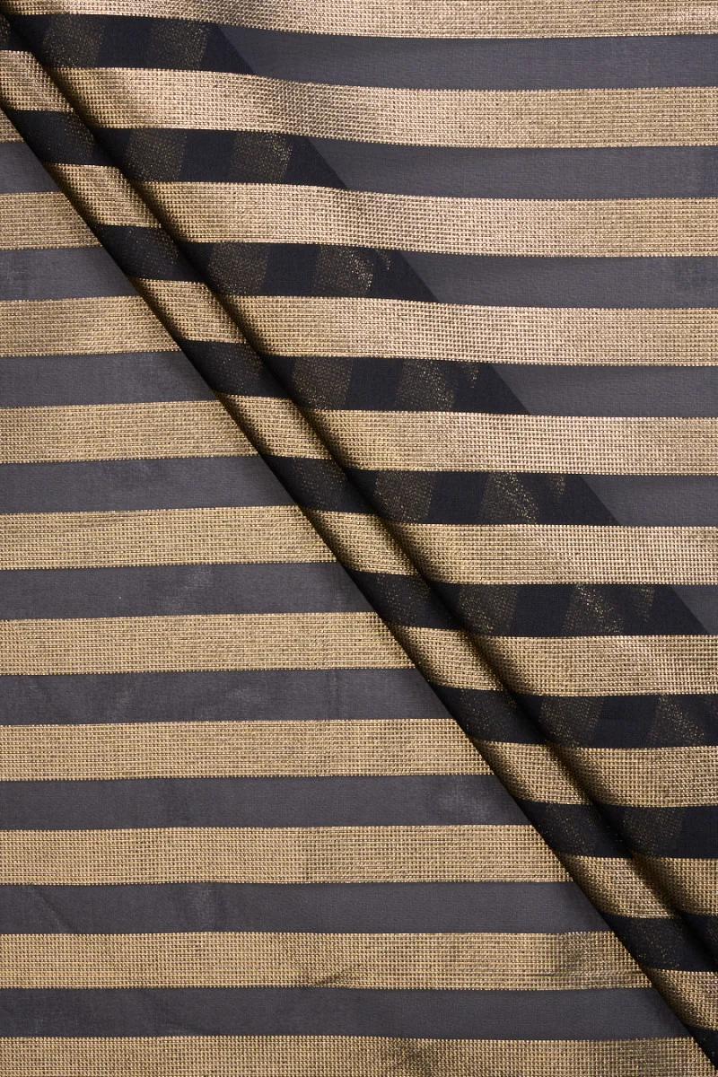 Italian organza fabric in black with regular gold stripes 2 cm wide, repeating every 2 cm. The fabric is stiff, transparent, inelastic and thin. An exclusive proposition perfect for creating a unique skirt or dress.