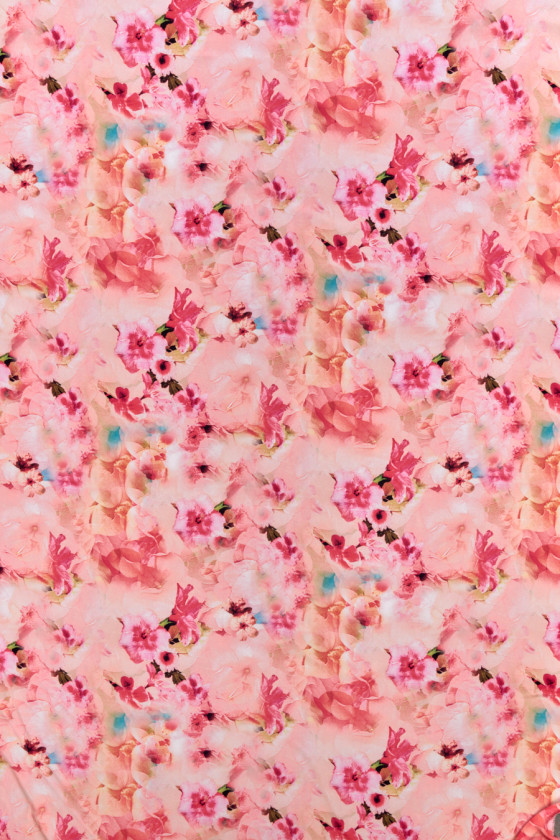 Italian 100% silk crepe with a motif of large, fuzzy flowers in pink, coral and orange. The fabric is delicate, thin but opaque, semi-matte and light. A romantic proposition that will work well with summer dresses, skirts, blouses.