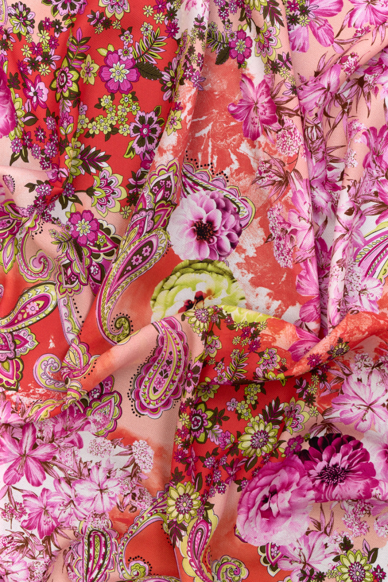 Italian 100% silk fabric with a very delicate jacquard weave. A rich, floral pattern complemented by paisley motifs, all in orange, pink and lime green. The fabric is very light, inflexible, soft, slightly transparent. Perfect for summer clothes such as dresses, skirts, blouses or parea.