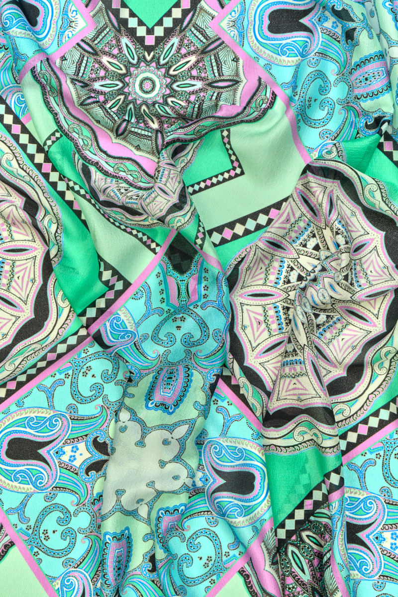 Italian fabric woven from 100% natural silk with oriental-geometric motifs. Large patterns in fresh shades of green, pink, blue, sharpened with black elements. The fabric with a delicate jacquard weave is slightly transparent, flowing, pleasant to the touch and inelastic. A great proposition for dresses, skirts, blouses and shawls.