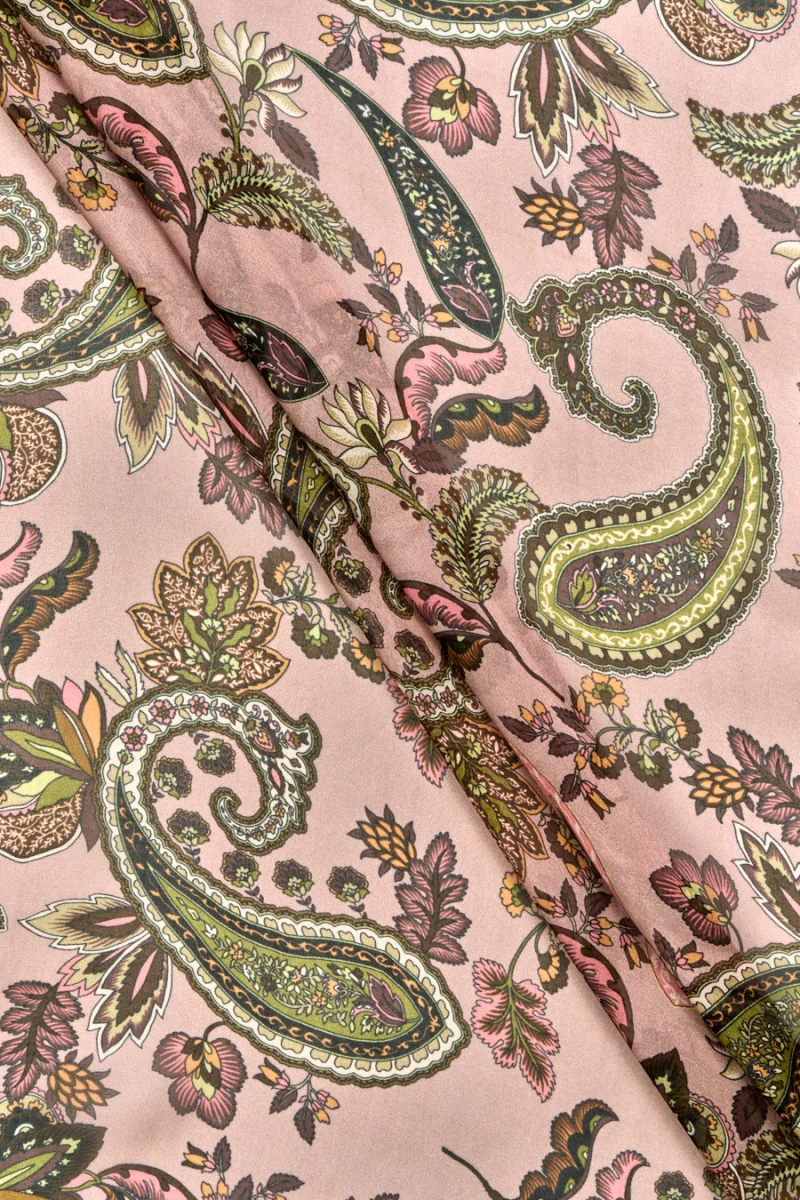Italian fabric woven from natural silk and viscose with green paisley motifs, orange and pink floral elements on a dirty, pink background. The fabric is very light, airy, transparent, delicate and non-elastic. A great proposition for dresses, skirts, blouses and shawls.