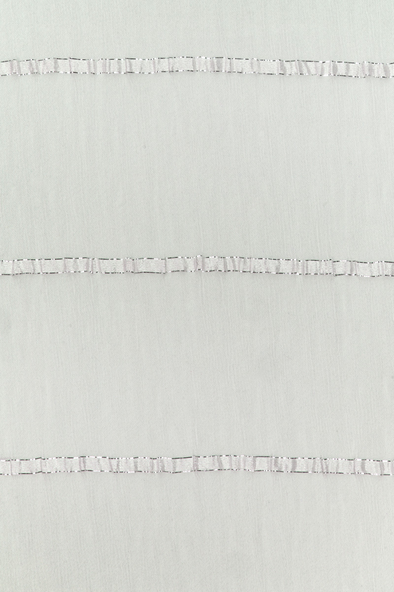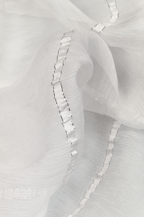 Italian silk chiffon delicately creased in white with a drop of light gray. The fabric is decorated with thin stripes that look like ribbons. The pattern finished with silver thread is repeated every 6 cm and is placed along the width of the fabric. The fabric is delicate, transparent, matte, flowing and light. A beautiful proposition for blouses, dresses, skirts and scarves.